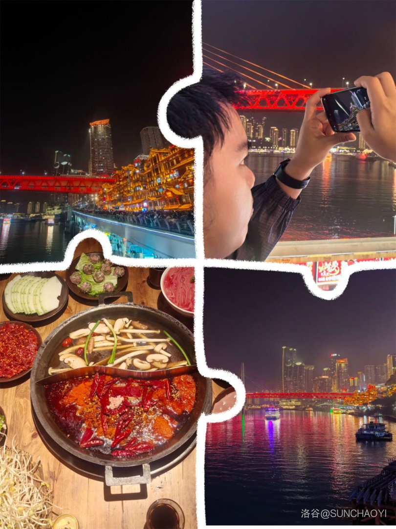 晚上去了洪崖洞,人真 tm 多,还有一亿个跟传销一样的不知道哪来的人问“拍照吗,坐船吗”,真无语了😅,把一个景区搞成这样也是无敌了。人群里面挤了一会之后选择走跨江大桥,江景还可以,就是桥有点高有点哈人。最后坐地铁回来了。