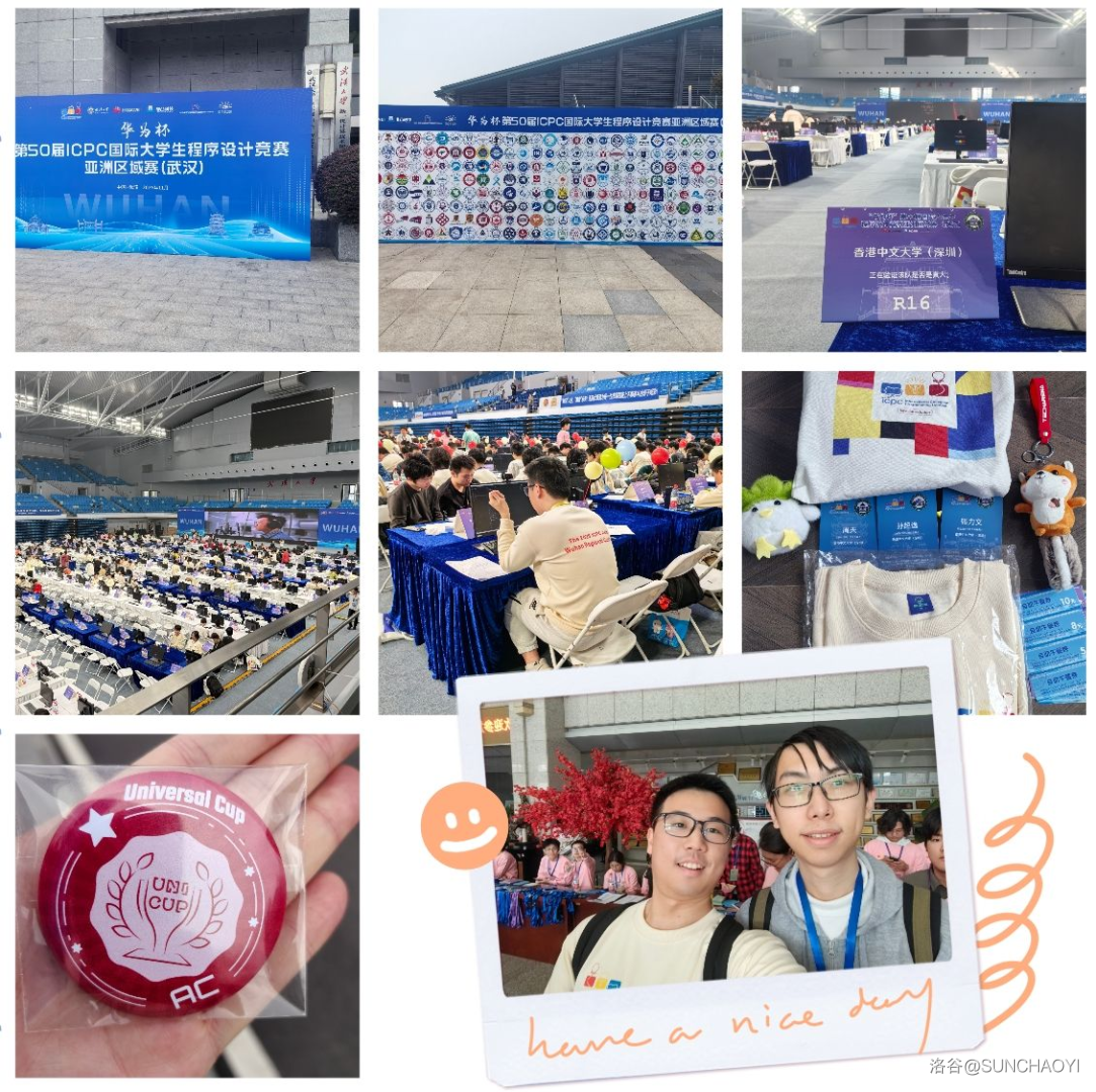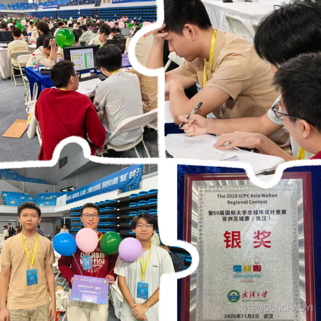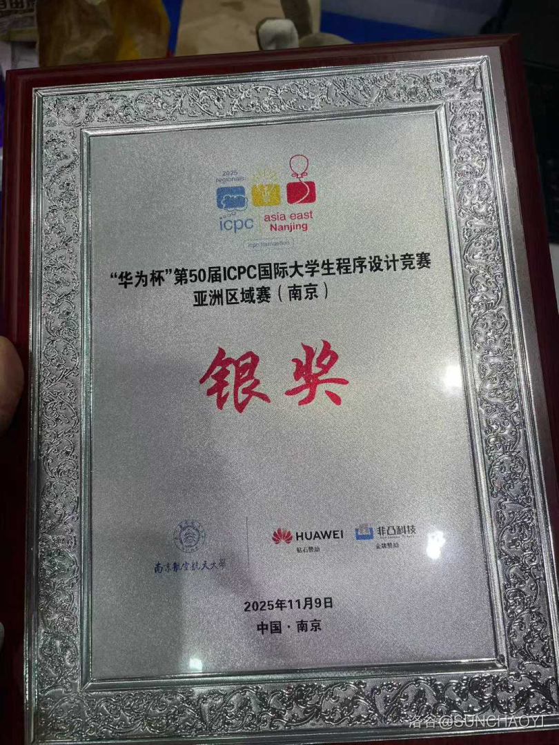 再次获得银牌!本来我们是看着 SUA 出题组非常好,之前 vp 相对来说比较舒服才来的,没想到今年题目出这么难,从第四题开始已经很吃力了。一小时切了两道签到后,zlw 佬又切了一道相对没那么难的题,然后就没题做了,我看了 BGI,尤其是认真地推了下 G 的式子,但一个多小时都没得到很好的做法。这时 zlw 佬和孙✌两个人一起做出了 H,甚至是跳了两题的难度,属于是完全没想到。最后三个人一起想 G 和 I,但是都没做出来,封榜后也没做啥题,有点可惜。