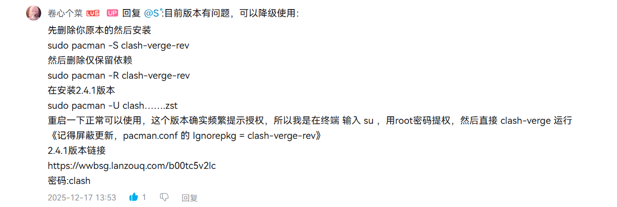 我当时因为这个 TUN 模式搞了一个多小时,因为我记得我在 xfce 下是直接管理员模式打开就能用的,但是这个 niri 不知道为什么不行,而且看这个视频教程一下载就安装好服务然后打开 TUN 模式了,急死我了。最后翻了下评论区发现也有小伙伴跟我遇到同一个问题,而且这个 UP 主还给了回复!