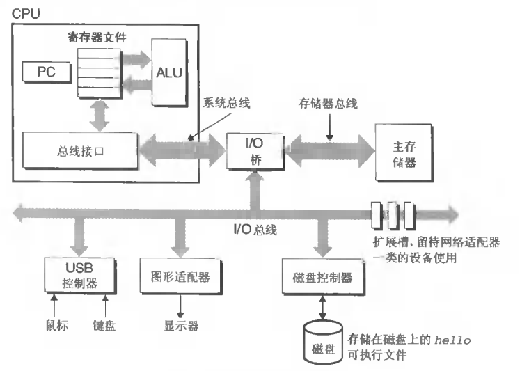 此刻,我们已经将源程序编译成了可执行目标文件 hello,并被存放在磁盘上。然后我们将其运行!关于这个时候程序发生的事情,我们需要了解系统的硬件组成(下图)。