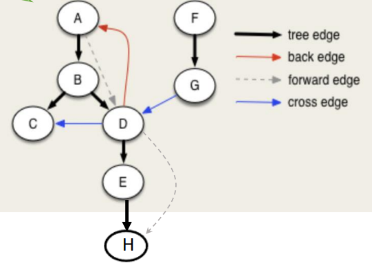- Tree Edge: When we first discover a new vertex $v$ from $u$.