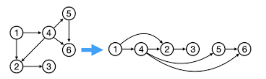 Theorem: $G$ is a DAG iff there is a linear ordering of all its $v \in V$ s.t., if $(u, v) \in E$, then $u < v$ in the above ordering. Or we say $(u,v)$ goes always from left to right.