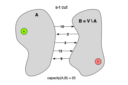 割的定义是顶点的集合,在网络流中特指 $s-t$ 割,即我们将顶点集合 $V$ 划分成 $S$ 和 $TY$,使得: