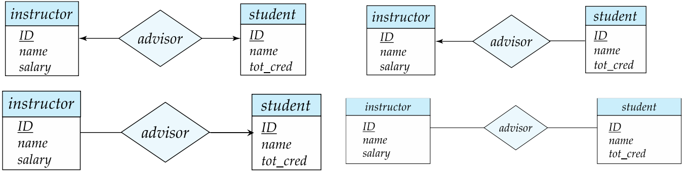 在 ER 图中,我们用单箭头直线($\rightarrow$)来表示“一”,用无箭头之间($-$)来表示“多”。下图从左上到右下分别是一对一、一对多、多对一、多对多。